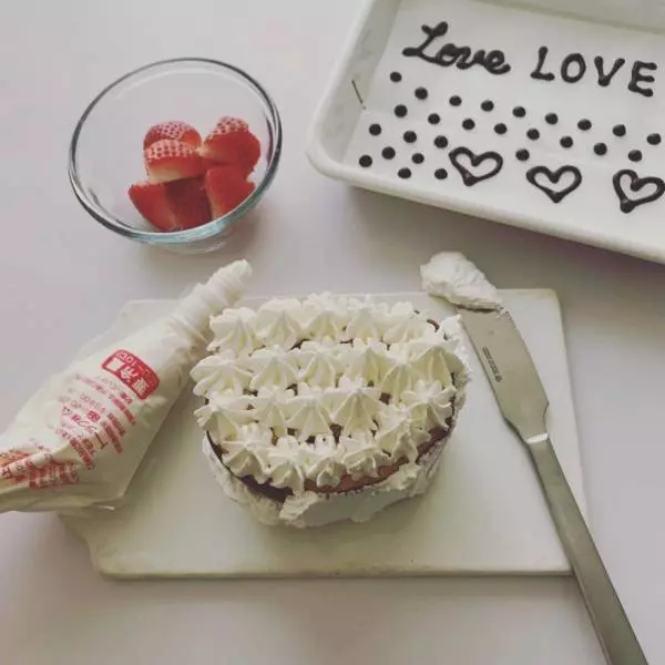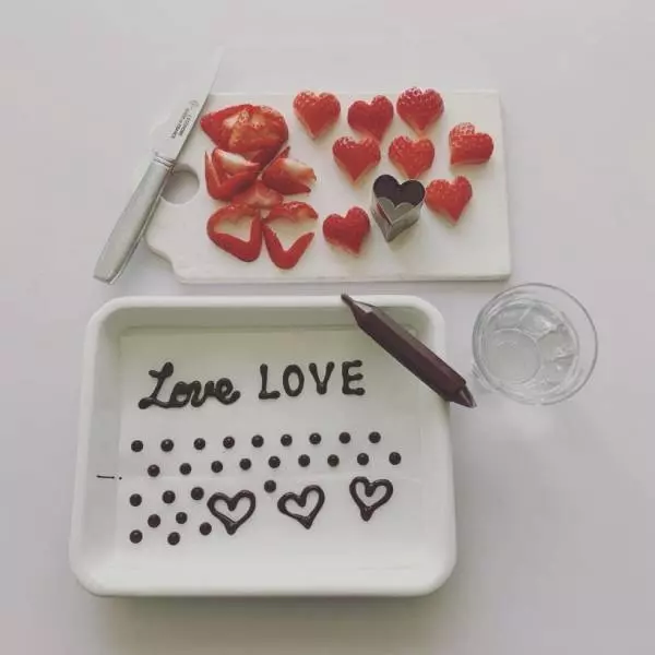 イチゴを縦半分に切って小さなハート型で抜き、抜いた残りは小さく刻む。チョコペンをお湯で温めて溶かし、クッキングペーパーの上に飾りのLOVE(お好みでローマ字でも筆記体でも)、ハート、小さな粒々を絞って、冷蔵庫で冷やし固める。