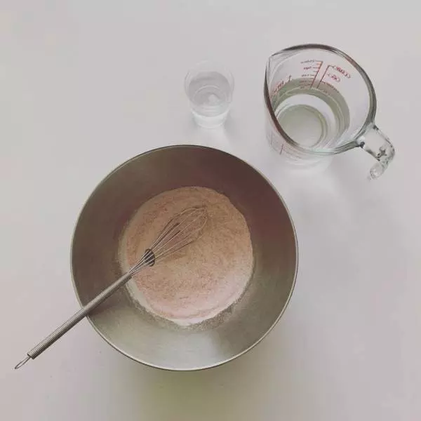 ボウルにプチプリンミクス1箱とイチゴパウダーを入れて泡立て器で混ぜる。