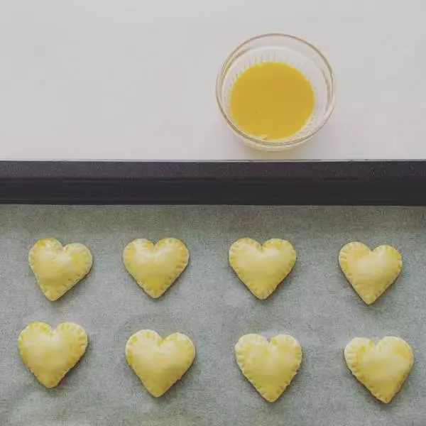 クッキングペーパーを敷いた天板に③を並べて、卵黄液を表面に塗る。200℃のオーブンで10分ほど様子を見ながら焼く。ふくらみすぎた場合はフォークなどで軽く押さえる。