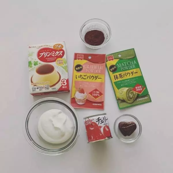 材料(抹茶プリン2個分、イチゴプリン3個分)