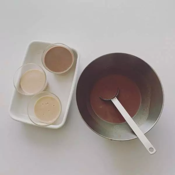 ②のイチゴプリンが固まったら、①のイチゴパウダーをココアパウダーに代えてつくったものをプリンカップに注ぎ入れて、再度冷蔵庫で1時間以上冷やして固める。