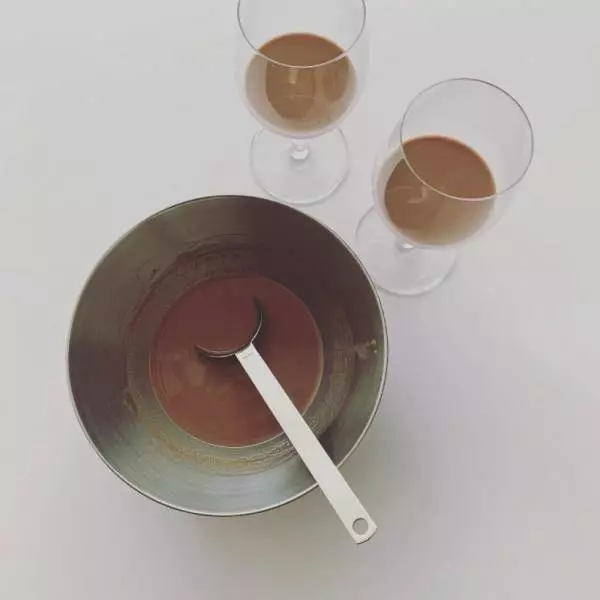 大人用は、チョコプリン液をワイングラスに2等分して注ぎ入れ、冷蔵庫で1時間以上冷やして固める。