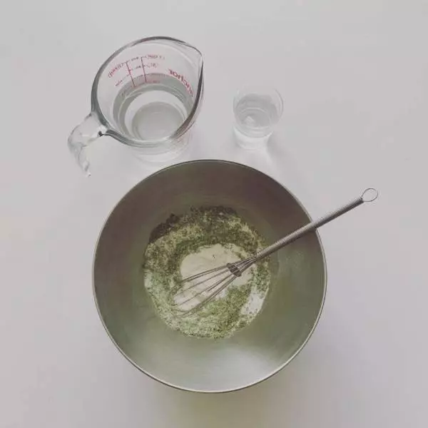 大人用は、①のイチゴパウダーを抹茶パウダーに代えてつくる。ワイングラスに2等分して注ぎ入れ、冷蔵庫でさらに1時間以上冷やして固める。