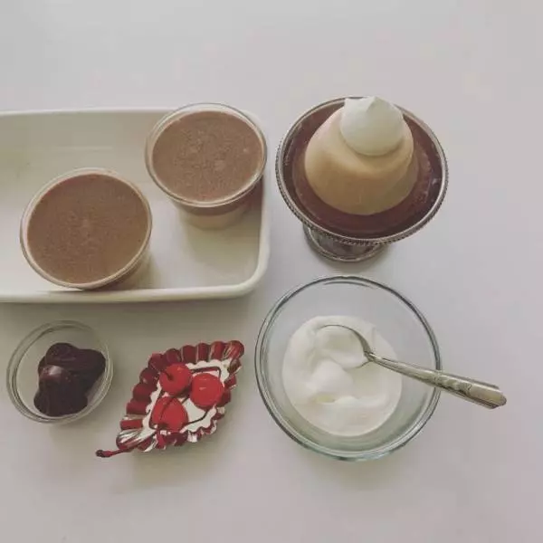 固まったら型から出し、泡立てた生クリーム、ハート型チョコを乗せて、サクランボを飾る。抹茶チョコプリンはグラスに入れたままで、生クリーム、ハート型チョコ、抹茶パウダー(分量外)を少し振りかける。※抹茶が少し分離しますがお味に影響はありません。