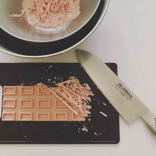 イチゴチョコレート(ブラックチョコレート)を包丁で細かく刻み、湯煎で溶かす。