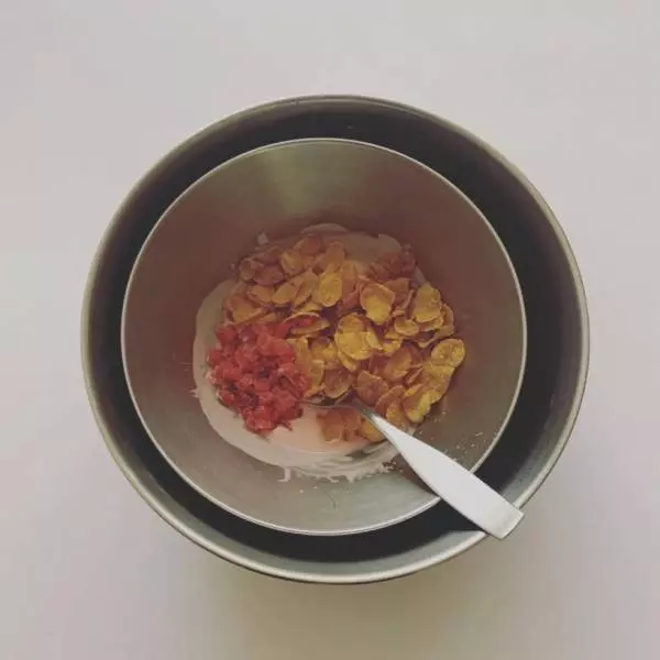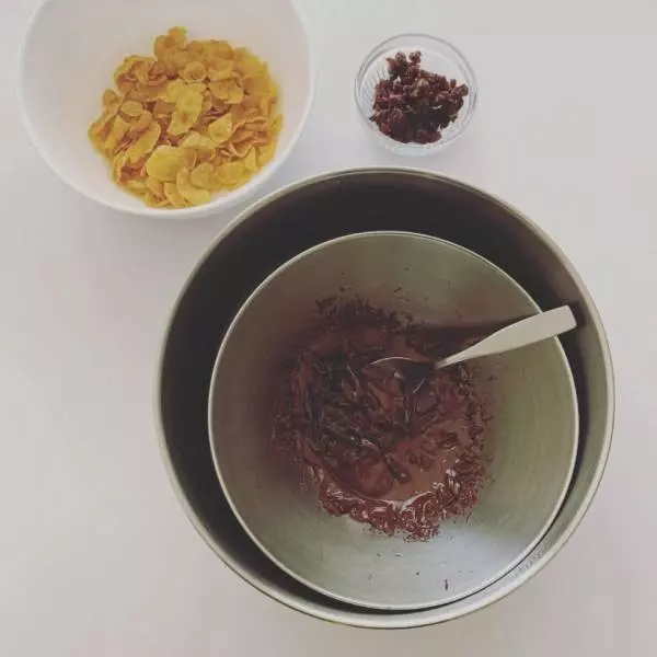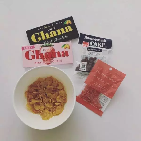 溶かしたイチゴチョコレートに、コーンフレーク、ドライストロベリーを加えてスプーンで混ぜる。このときコーンフレークを崩すか崩さないは、お好みで。