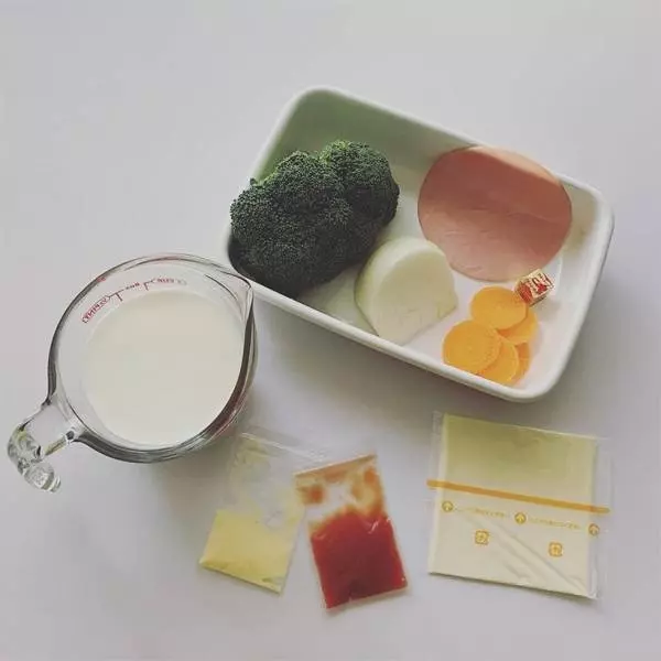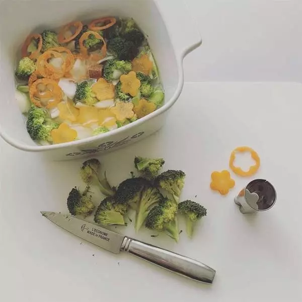 1.小鍋に水150ml、コンソメキューブ、適当な大きさに切ったブロッコリー、タマネギ、花型で抜いたニンジン(型抜きして残ったものも一緒に)を入れて火にかける。野菜が柔らかくなるまで煮込む。柔らかくなったら、ニンジンの花の部分だけを取り出しておく。
