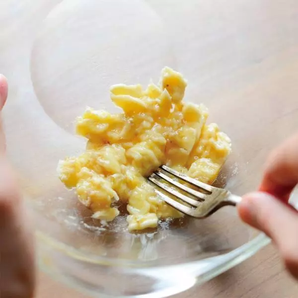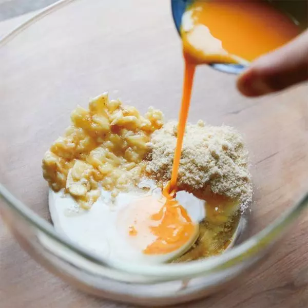 ①ボウルにバナナを少し形が残るくらいに潰す。