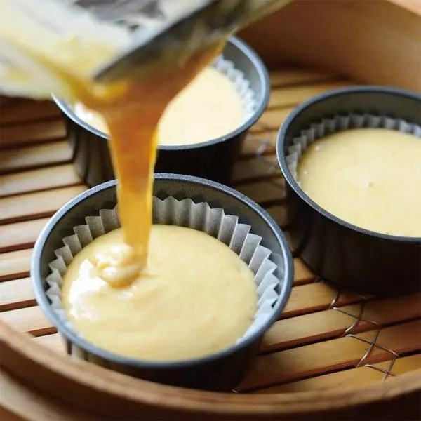 ④③を4等分で耐熱カップに注ぎ、沸騰させた蒸し器に並べる。