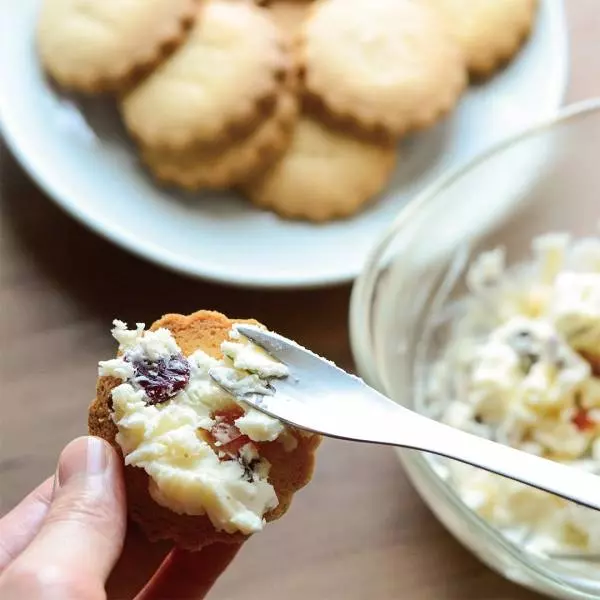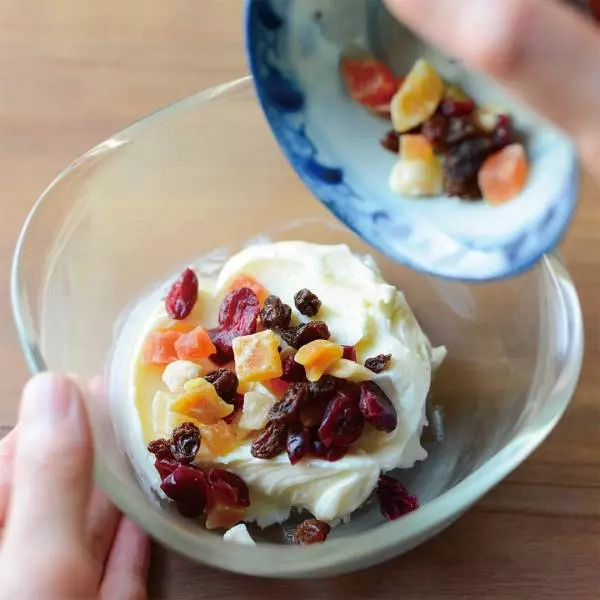 ⑤電子レンジ200wで1分半温めたクリームチーズに粉砂糖、レモン果汁の順に加え、その都度よく混ぜる。ドライフルーツを加えて仕上げに混ぜる。