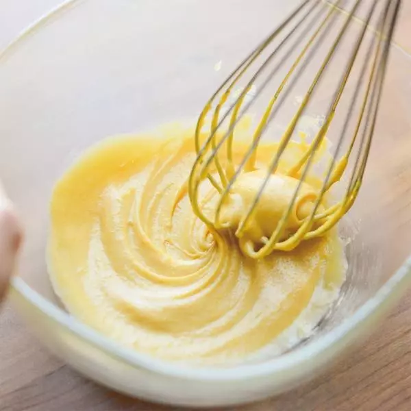 ①ボウルにバター、きび砂糖、卵黄、塩を加え、ホイッパーでよく混ぜる。