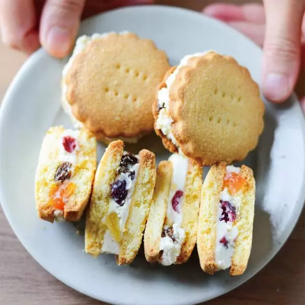 クッキーサンドを半分に割ると、ドライフルーツの断面がとっても可愛くて、プレゼントやおもてなしにもぴったりのレシピです。
