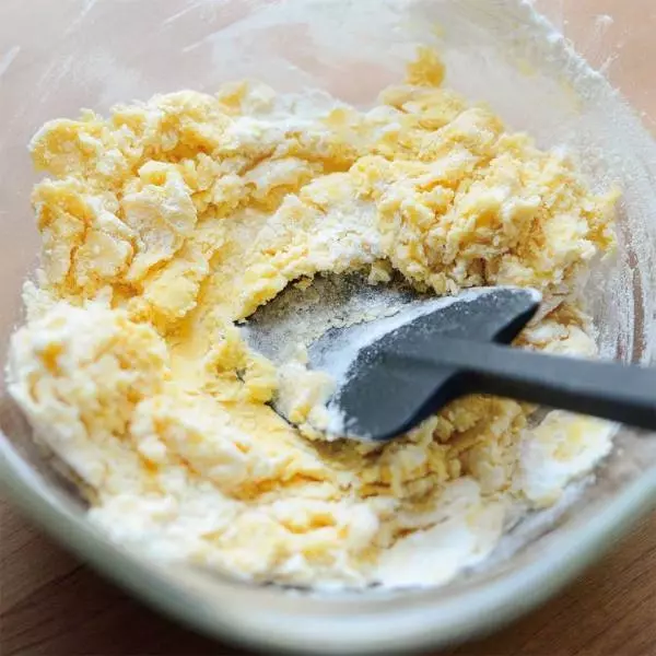 ②①に製菓用米粉を加え、粉気がなくなるまでゴムベラでよく混ぜる。ひとまとまりになったらラップに包んで、冷蔵庫で1時間ほど冷やす。