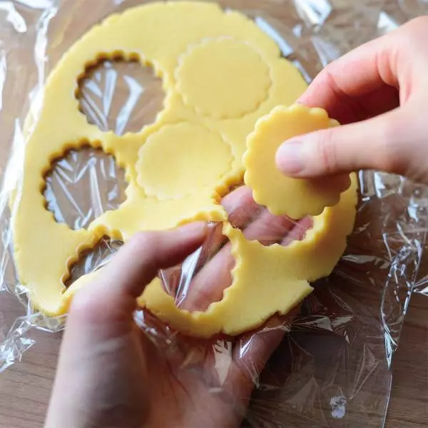 ④5ミリほどの厚さにのばした生地を、クッキー型で型抜きする。ポイントは生地が冷たいうちに作業すること。170度に予熱したオーブンで12〜15分ほど焼く。