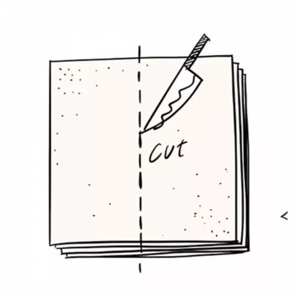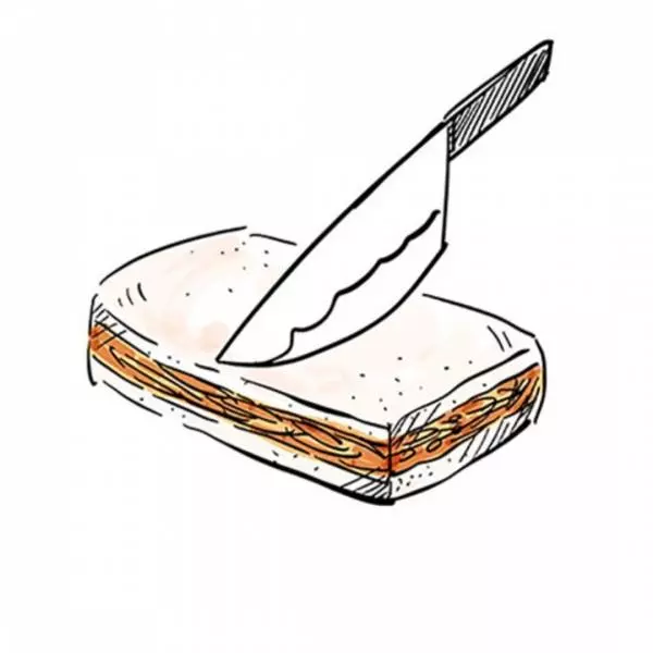 ⑥各具材を挟んだらラップでくるみ、そのままラップの上から包丁で半分に切る。