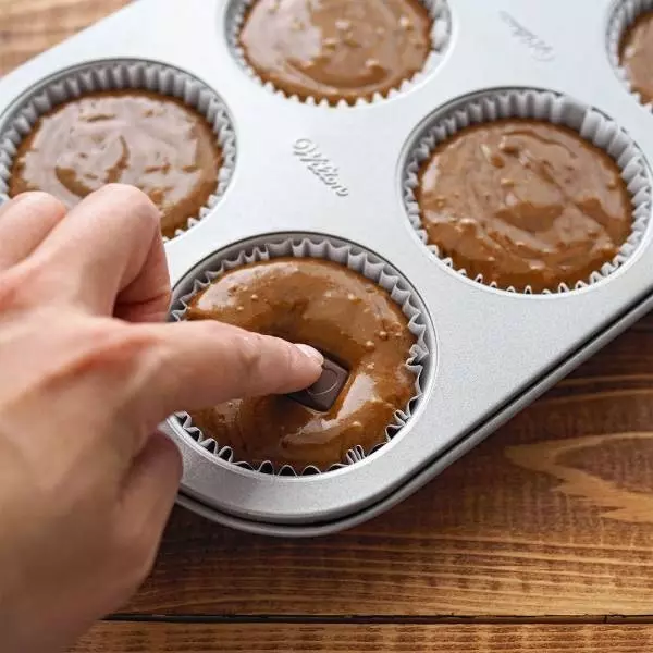 ⑦ひとくちチョコを2粒ずつ生地の中に押し込む。子どもが楽しくできるポイント!