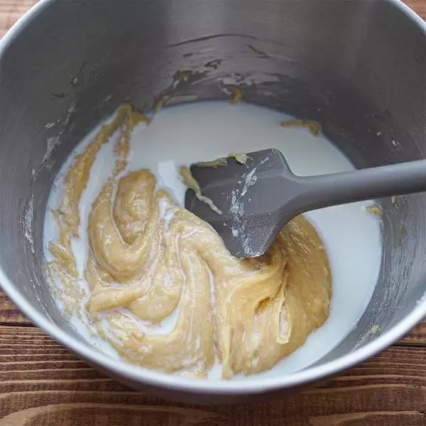 ④牛乳を入れて混ぜ生地をゆるめる。