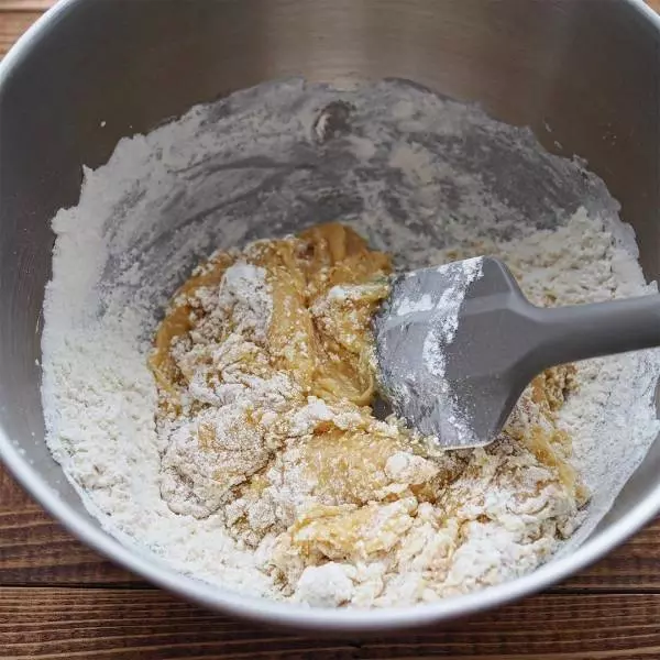 ③ふるっておいた粉類を入れ、ゴムベラで練らないようにさっくりと混ぜる。