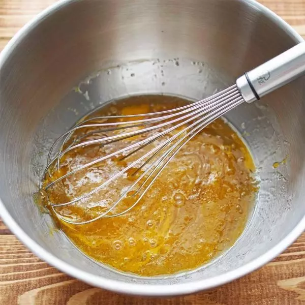 ①ボウルにサラダ油、きび糖を入れよく混ぜる。②卵を割り入れてよく混ぜる。