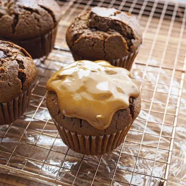 ⑪冷めたマフィンにコーヒーアイシングをたらす。