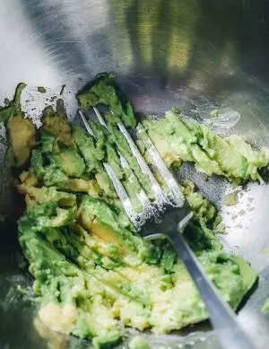 ②もう半分のアボカドはボウルに入れて、フォークの背の部分で潰し、<調味料A>を入れてよく混ぜ合わせる。