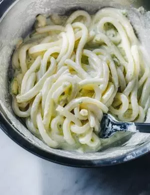 ④冷凍うどんは、パッケージの表記通りに茹でて(もしくはレンジアップ)、冷水でしめる。うどんの水をよく切って、2のボウルに入れてよくかき混ぜる。