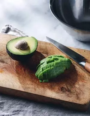 ①アボカドをカットし、種を抜いて皮を剥く。アボカド半分を1cm角にカットしてレモン果汁をかける。