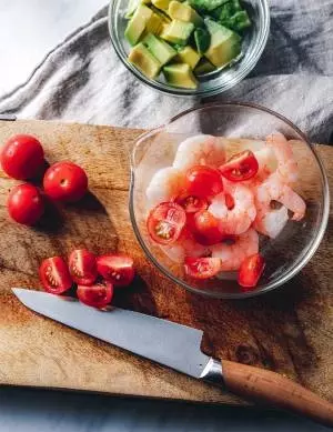③カットしたミニトマトとボイル海老に、<調味料B>を和える。
