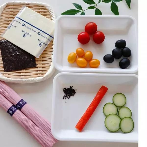 ⑤ ①のミニトマトとブラックオリーブをそうめんの上にのせて、丸くくり抜いたチーズと海苔を貼り付けて金魚をつくる。