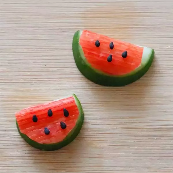 ③輪切りのキュウリを半分に切り、カニかまと黒ごまをのせてスイカをつくる。