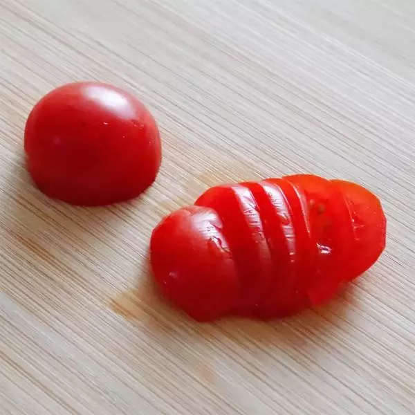 ①ミニトマトとブラックオリーブを半分に切り、片方をスライスする。