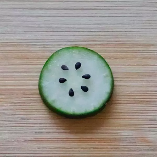 ③輪切りのキュウリを半分に切り、カニかまと黒ごまを乗せてスイカをつくる。