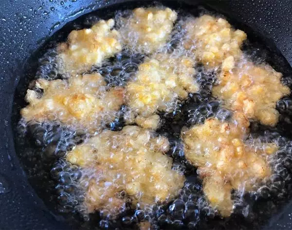 ※混ぜすぎないようにしてください。3.1のトウモロコシを2のボウルに入れてスプーンで衣が絡むように混ぜる。4.フライパンに油を入れて170〜180℃くらいに熱し、カリッとするまで揚げる。