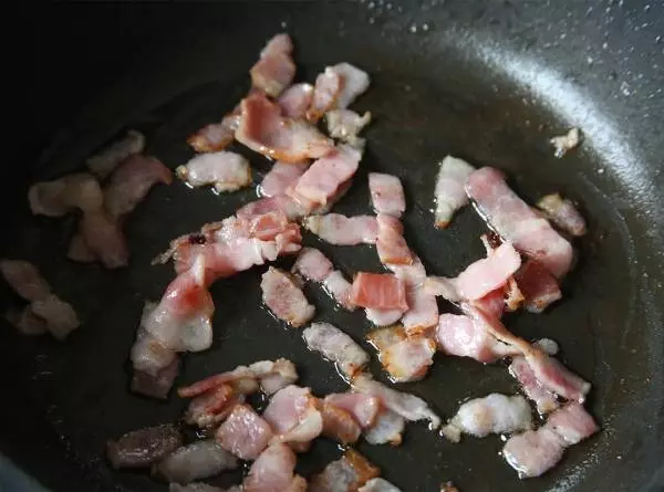 ③その間にフライパンにオリーブオイルを熱し、ベーコンをほんのり焦げる程度に焼く。