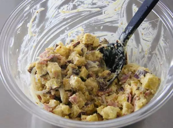 ベーコンは端っこがカリカリになるくらい焼くとよりおいしく仕上がる。④②のサツマイモの粗熱が取れたら、③と☆を入れ、混ぜ合わせる。