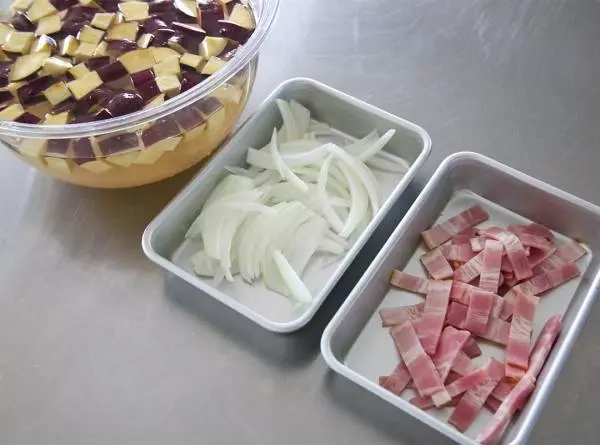 ①サツマイモを1cmの角切りにして3分間水にさらす。タマネギは薄切り、ベーコンは1cmの短冊切りにする。サツマイモの皮は剥いてもOK。