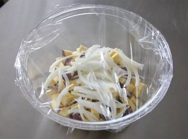 ②耐熱ボウルに、サツマイモ、タマネギの順にのせて、ふんわりラップをかけて電子レンジ600wで5分加熱する。