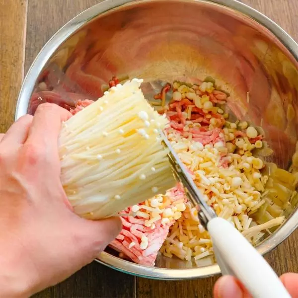 ①豚だんごをつくる。ボウルに豚ひき肉と細かく切ったエノキ、【A】を入れて練り混ぜる。エノキはキッチンバサミで切ると時短に!