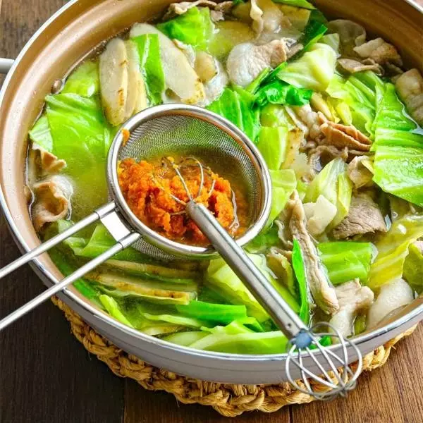 ④全体に火が通ったら、味見をしながら味噌を溶き入れて出来上がり! 器に盛り、お好みで粗びき黒胡椒を振る。