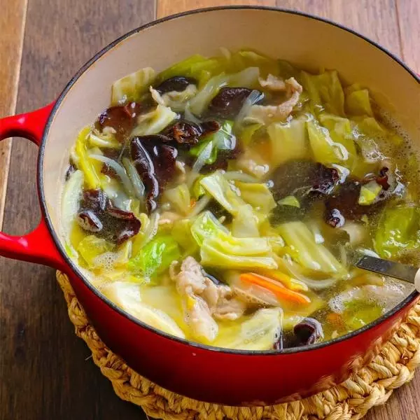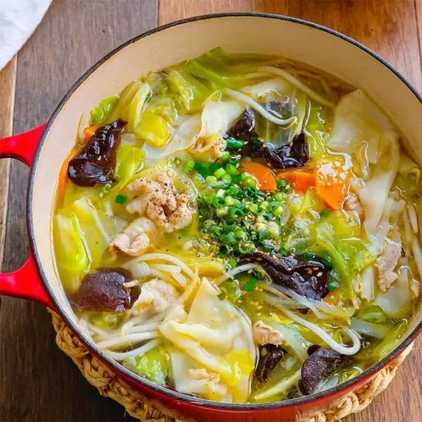 【変わり鍋レシピ】野菜たっぷり! ワンタンの皮入りタンメン風スープ鍋