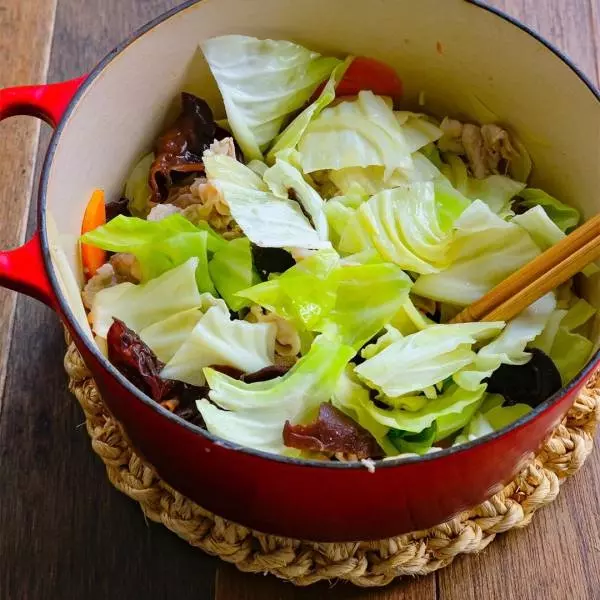 ②豚肉に火が通ったら、キャベツ、キクラゲを加えてさらに炒める。