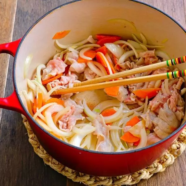 ①鍋にごま油を熱し、豚肉、ニンジン、タマネギを加える。塩・胡椒を少々振って炒める。