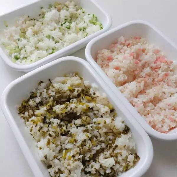 ①酢飯全量にすりごまを混ぜ合わせたら3等分にし、刻んだ高菜、ガリ、キュウリをそれぞれに混ぜ込む。