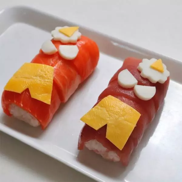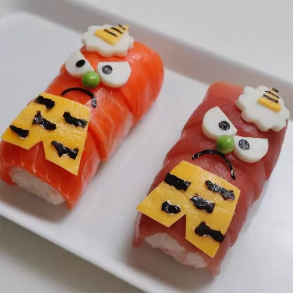 ⑧マグロとサーモンのお寿司はオニにする。かまぼこでオニの頭と目を、薄焼き卵でパンツとツノをつくる。それぞれ飾りをのせる。
