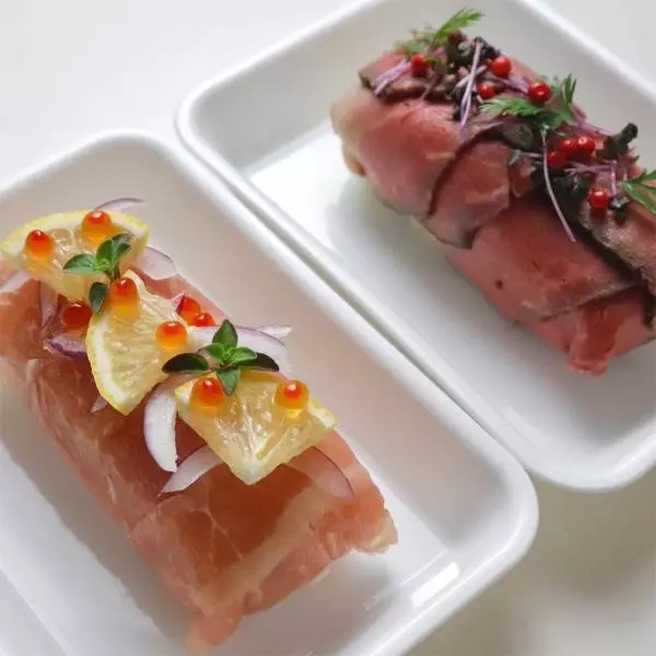 ⑦飾り付けをする。まずは生ハムのお寿司の上に、レモンやタマネギ、イクラやハーブをのせる。ローストビーフのお寿司の上に、ピンクペッパーやハーブなどを飾る