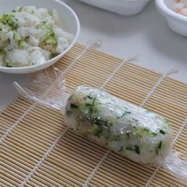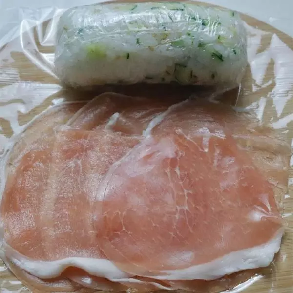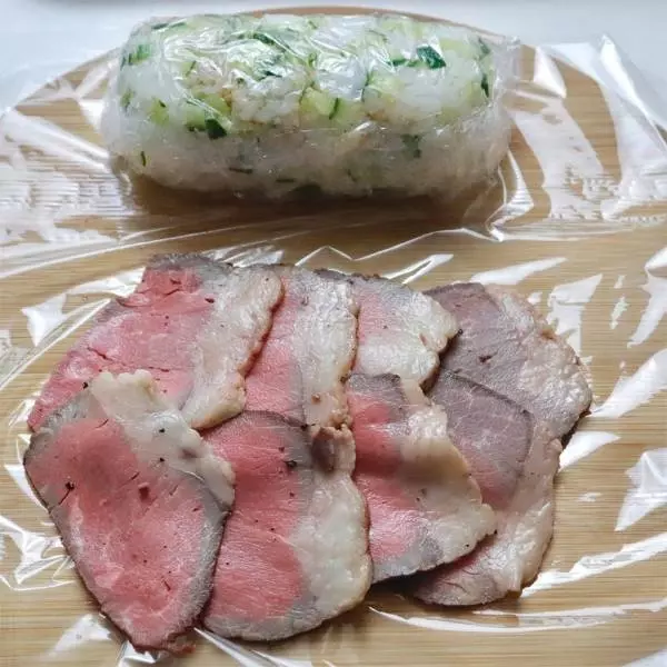 ⑥ 同じ手順で、ローストビーフと生ハムの上にキュウリの混ぜご飯をのせて、ラップを使って巻く。