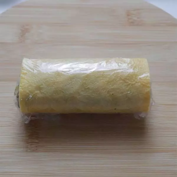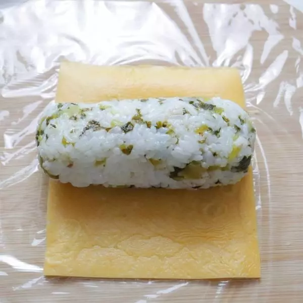 ラップの上に薄焼き卵をのせ、高菜の混ぜごはんを置く。
