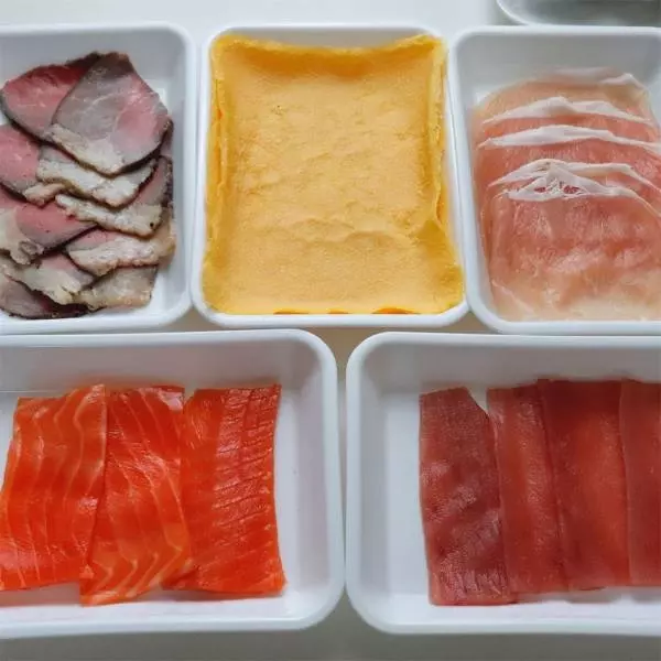 ②薄焼き卵、サーモン、マグロ、サーモン、ローストビーフ、生ハムを準備する。