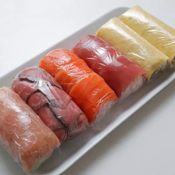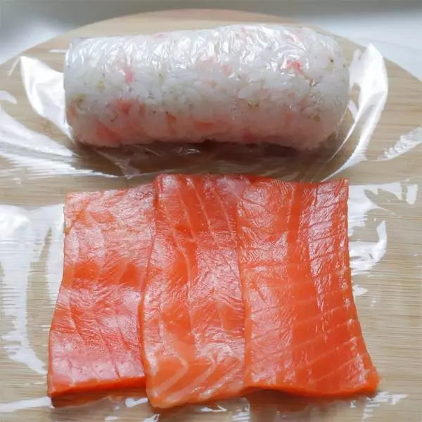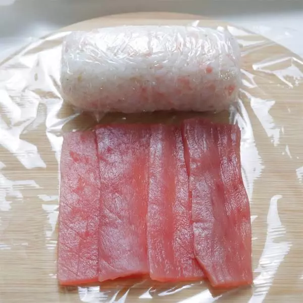⑤同じ手順で、マグロとサーモンの上に、ガリの混ぜごはんをのせて、ラップを使って巻く。