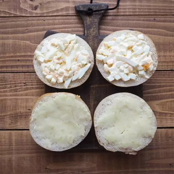 ②表面にポテトマヨサラダ・玉子マヨサラダをそれぞれ塗る。